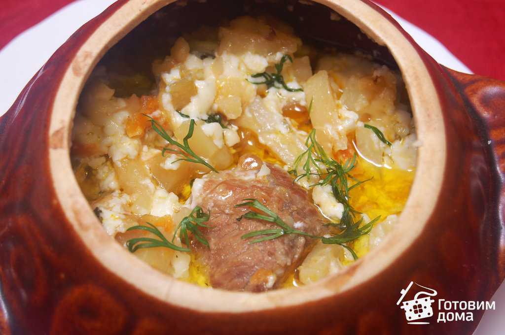 - Поставить горшочки на средний уровень духовки при температуре 220 градусов. Когда содержимое начнет кипеть, убавить температуру до 170. Запекать до готовности. Общее время в духовке – примерно полтора часа. Готовность проверяется мягкостью картошки – она должна рассыпаться.