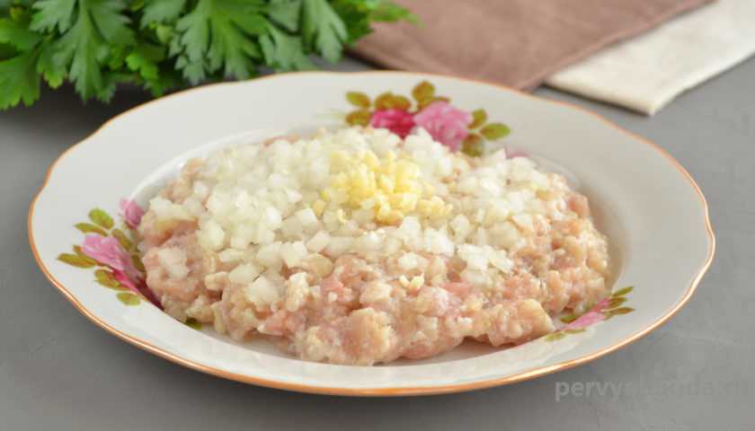- 300 г свиного фарша соединить с измельченными 2 дольками чеснока и луковицей, ввести соль, специи. Вымешать массу.