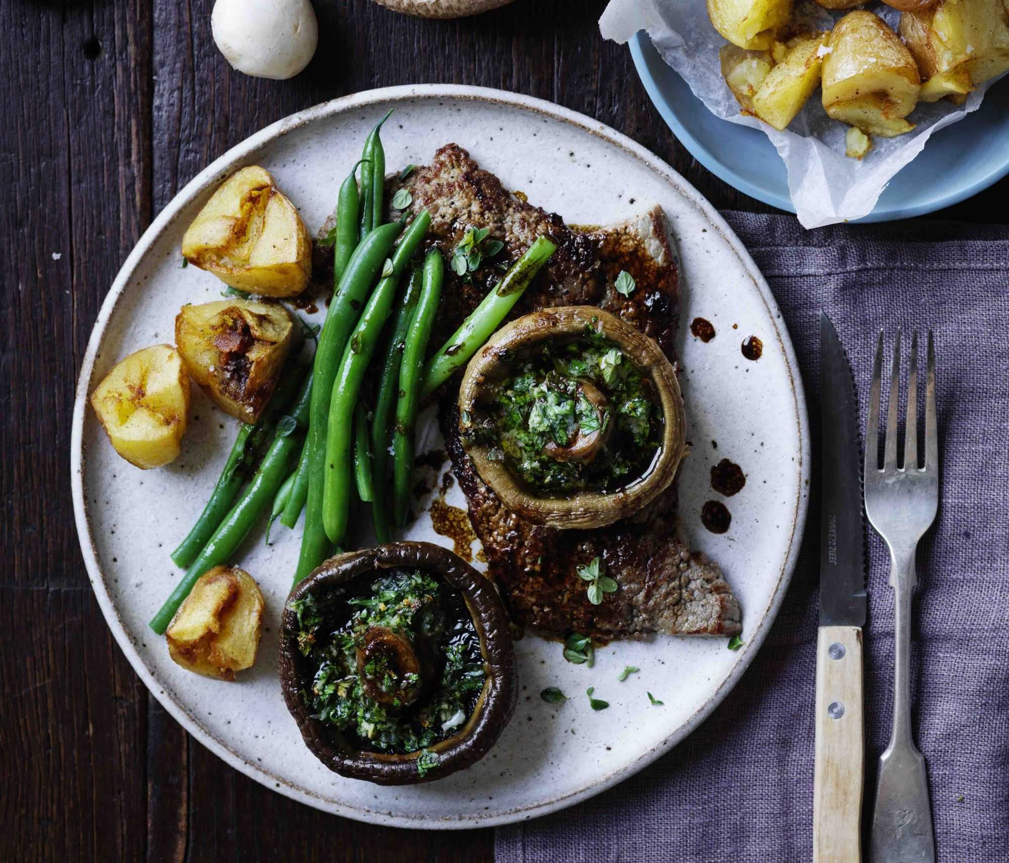 Вместо того, чтобы подавать жаркое с соусом, мы окружаем его грибами, которые были обжарены на сковороде для подрумянивания жаркого с небольшим количеством масла, лука-шалот, чеснока и зелени.