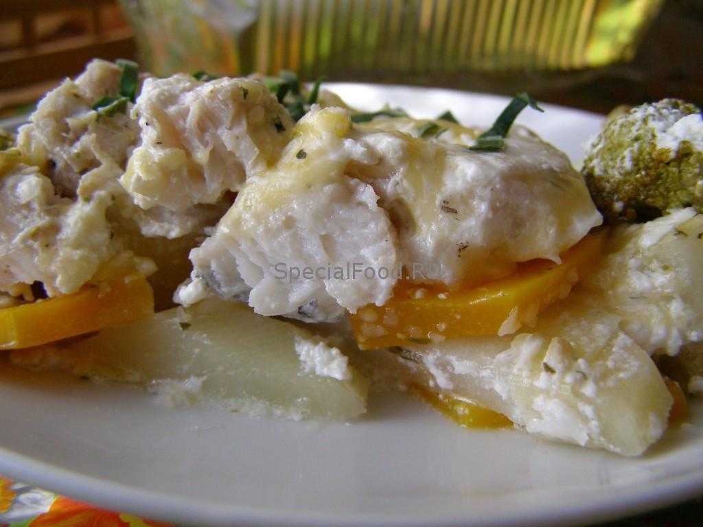 . Потребуются: 1 кг свежемороженой рыбы, 0,5 кг помидоров, столько же моркови, 250 г болгарского перца, 50 мл нежирной сметаны, 200 г репчатого лука, 1 лимон, соль, черный перец и кориандр по вкусу, немного растительного масла. Приготовление. Разморозьте хек, промойте и разделайте. Порежьте тушки на порционные куски толщиной 2 см. Сбрызните их соком лимона и оставьте так на 20 четверть часа. Пока рыба маринуется, помойте и почистите морковь, тонко ее нашинкуйте. Сладкий перец освободите от семян, ополосните и нарежьте соломкой. Почистите лук, превратите его в тонкие полукольца, но предварительно отложите 1 целую луковицу. Ошпарьте томаты кипятком, удалите верхнюю кожицу, нарежьте кусочками. Соедините подготовленные овощи и перемешайте. Затем выложите 1/2 их часть в казан с растительным маслом на дне. Сверху поместите филе хека и накройте его оставшейся овощной смесью. Пересыпьте каждый слой кориандром, посолите и поперчите блюдо. Поставьте емкость с кушаньем на медленный огонь и тушите его в течение 20-ти минут. После влейте еще немного масла, сверху положите разрезанную пополам луковицу, добавьте в казан 200 мл воды и продолжайте тушить хек с овощами еще с четверть часа. Последний штрих: убрав луковицу, полейте верх блюда сметаной и перемешайте все компоненты. Через 5 минут выключите под казаном огонь — диетическая рыба готова!