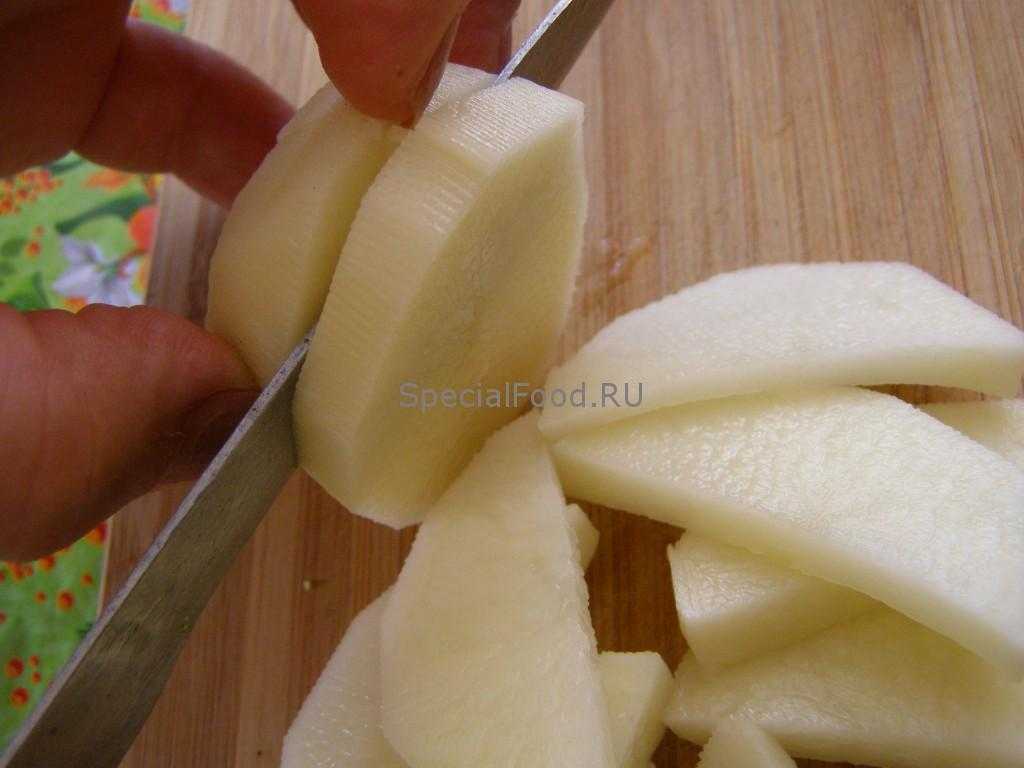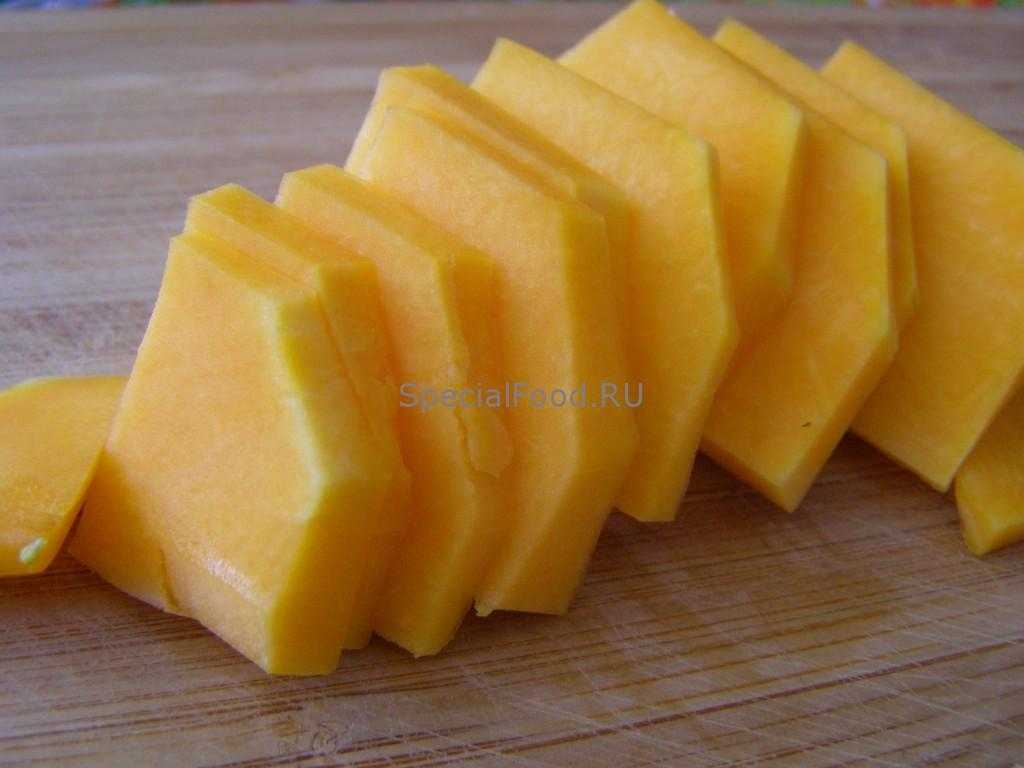 Очищенные и вымытые клубни нарежем пластинами, как и тыкву.