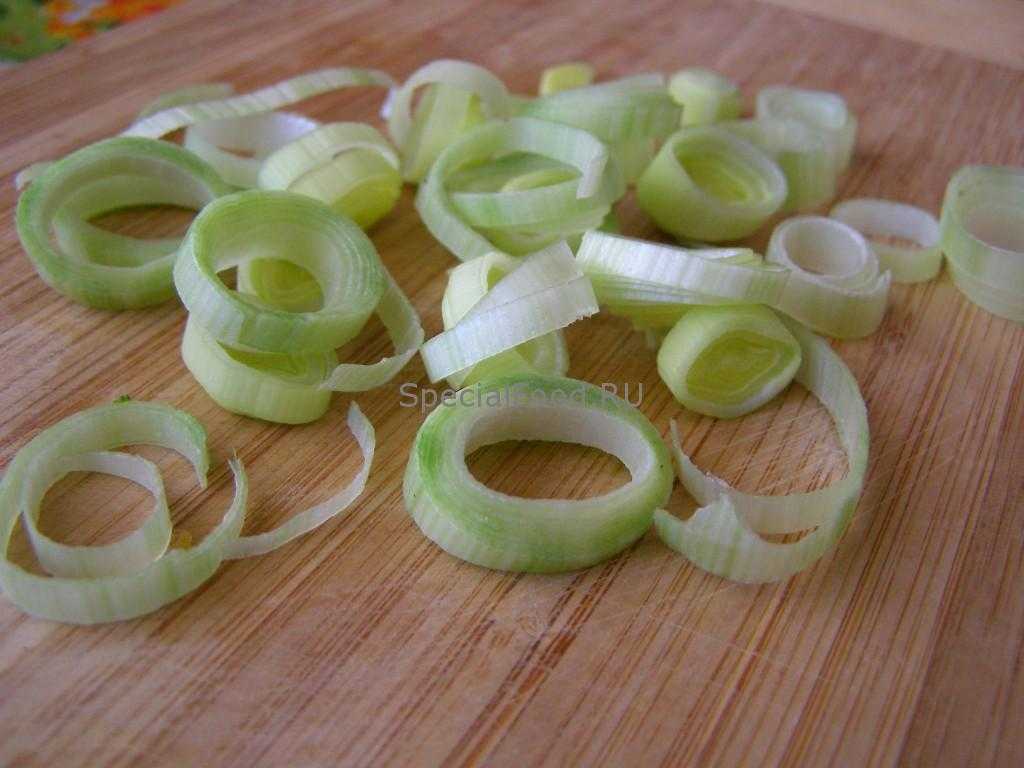 В этом блюде лук может быть использован любой, а у нас – это порей. Тут нужна будет и зеленая, и белая его часть.