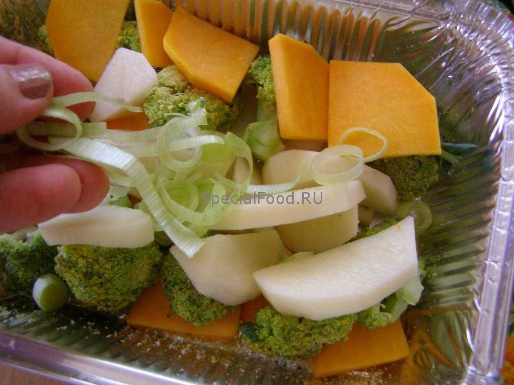 Выкладывание продуктов в форму можно делать послойно, то есть — слой картошки, потом тыквы, и проч. А можно рядами – ряд картошки, ряд капусты, и так далее