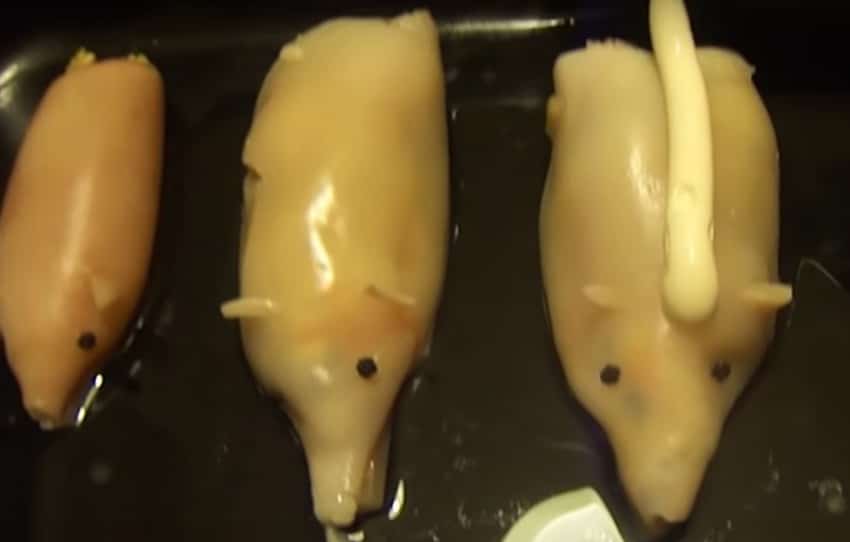 - Первым делом займитесь главным героем нашего блюда – его величеством кальмаром. Очистьте его от внутренностей и пленок. Вымойте. Обсушите бумажным полотенцем. Если моллюск свежемороженый, то, скорее всего, щупальца с головой вам удалять не придется. Это уже сделали за вас. Вам останется только отрезать «крылья» от «мантии», чтобы получился аккуратный «носочек» для фаршировки. У свежего морского обитателя, соответственно, отрежьте голову вместе со щупальцами. А затем отсеките щупальца и от головы примерно по линии расположения глаз. Голову кальмара отправьте к внутренностям и пленкам, то есть в мусор. В пищу эти части моллюска не используются. «Футлярчики» отложите пока в сторону. А «крылья» и щупальца измельчите, они пойдут в начинку.