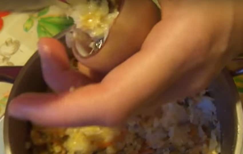 - Для начинки смешиваем рис, лук, грибы, добавляем по вашему усмотрению сметану или майонез, солим, приправляем.