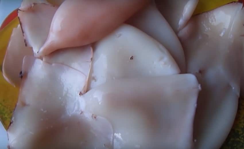 - Снимаем кожу с моллюсков, а затем обдаем их кипятком. Легче купить очищенные тушки, чтобы сэкономить немного времени.