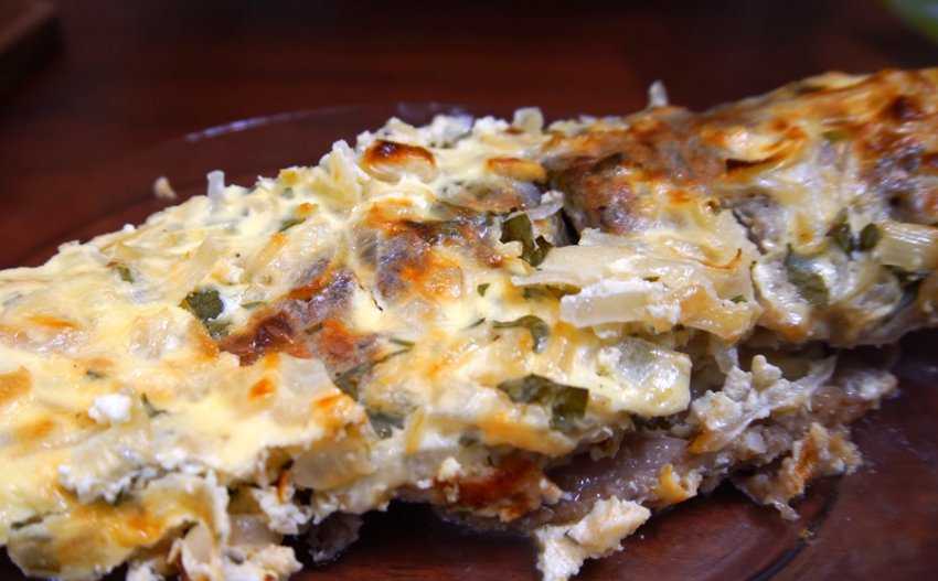 - Приготовить соус, смешав и взбив венчиком: сметану, майонез, сырые яйца, зелень и жареный лук. Можно добавить по щепотке перца и соли.