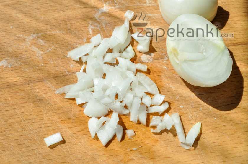С помощью ножа очищаем лук от шелухи и после тщательно промываем под проточной теплой водой. Затем выкладываем компонент на разделочную доску и мелко рубим кубиками. Измельченную луковицу пересыпаем в свободную тарелку.