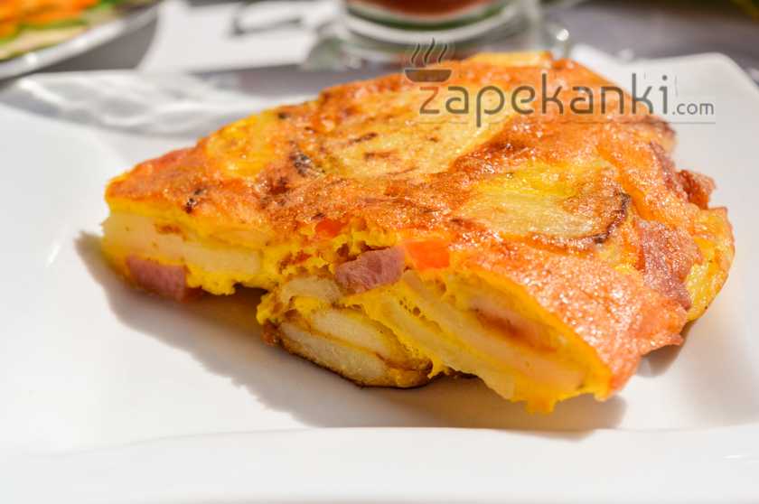 Еще горячую запеканку с помощью деревянной лопатки перекладываем из сковороды на специальную плоскую тарелку и подаем к обеденному столу вместе с ломтиками хлеба и салатом из свежих овощей. По желанию гостям можно предложить еще соленья, но ничего больше, ведь блюдо выходит очень сытным.