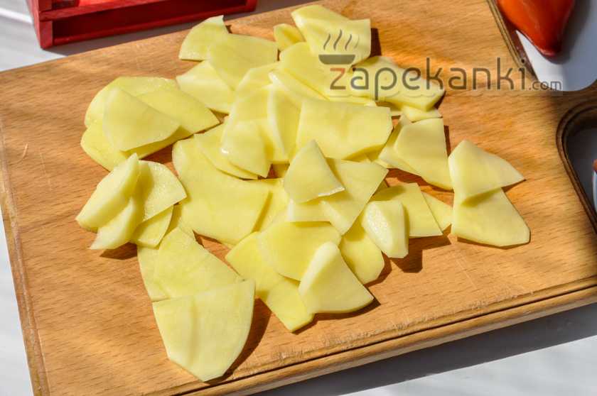 Воспользовавшись овощерезкой, очищаем картофель от кожуры и после тщательно промываем под проточной теплой водой, чтобы удалить остатки земли и другой грязи. Далее выкладываем овощи на разделочную доску и с помощью ножа нарезаем тонкой соломкой, кружочками или же небольшими кубиками. Поверьте, вкус запеканки от этого не поменяется, поэтому придаем клубням ту форму, которая вам больше нравится. Затем перекладываем картофель в среднюю миску и ненадолго оставляем в стороне.