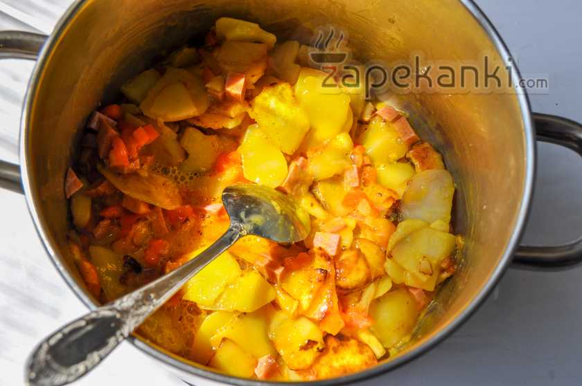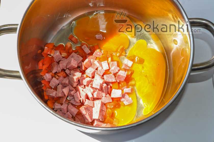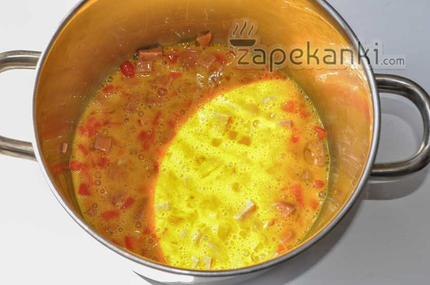 , пока яйца не возьмутся и у нас не получится плотная масса. В конце выключаем конфорку, но не спешим приглашать всех к столу. Пусть запеканка постоит под крышкой еще