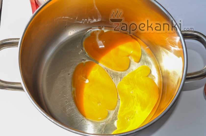 6. Куриные яйца вбиваем в глубокую кастрюлю.