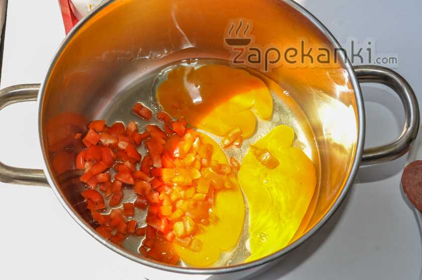 7. Болгарский перец лучше выбирать ярко красного или оранжевого цвета, чтобы запеканка вышла красивее в разрезе. Болгарский перец очищаем от плодоножки и семян, промываем и нарезаем мелкими кубиками, выкладываем к яйцам.