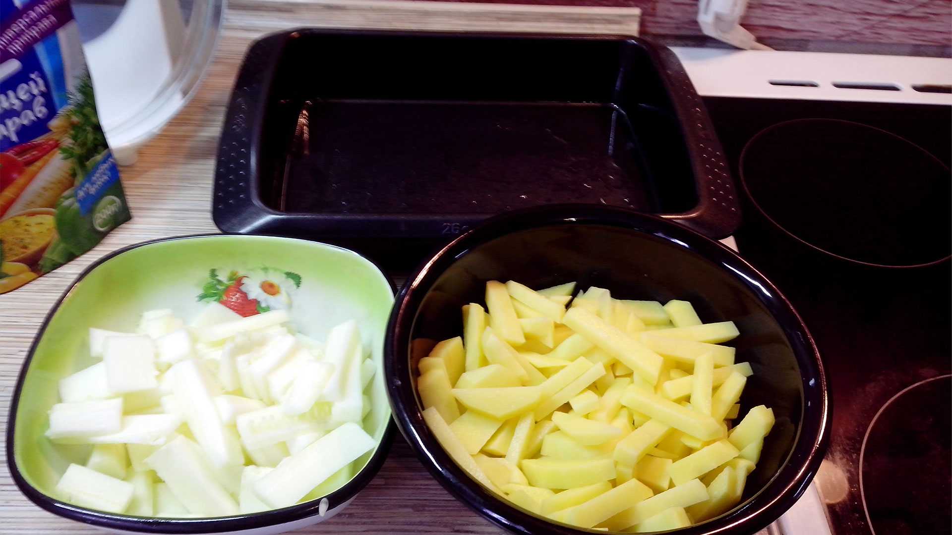 2. Очищаем картошку и крошим тонкими ломтиками. Солим, делим примерно на две части, одну из которых сразу перекладываем в форму.