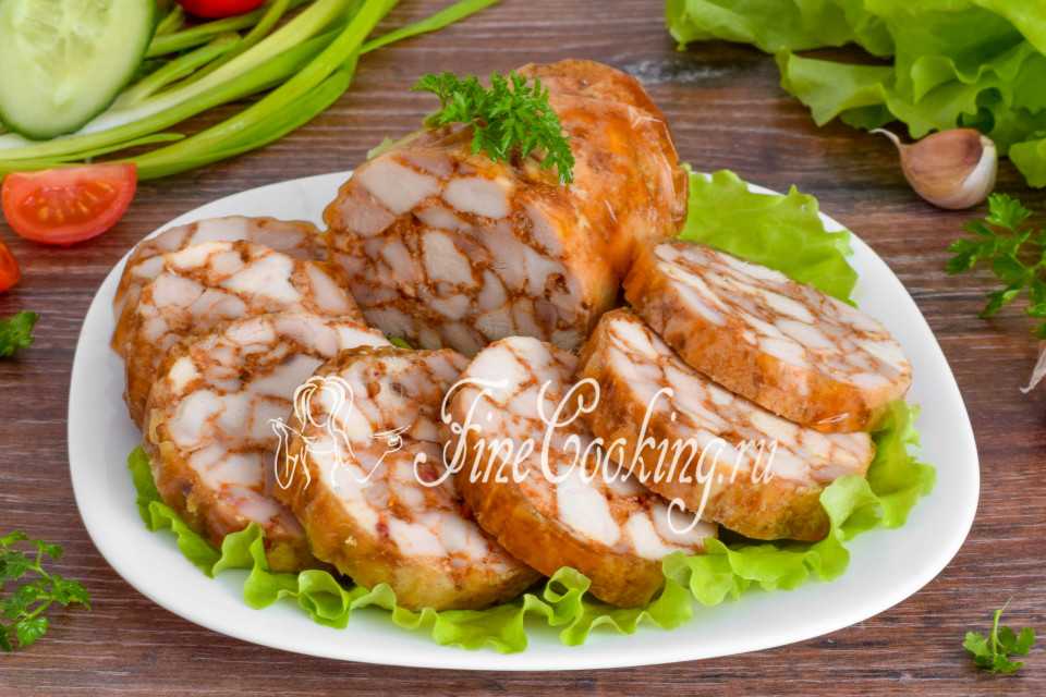 Удаляем рукав для запекания. В готовом виде Мраморный куриный рулет с желатином весит около 750 граммов.