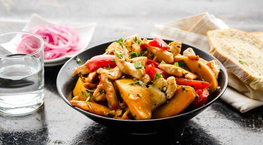 Нарезать курицу. Раздавить чеснок. Нарубить лук. Морковь нарезать соломкой. Также поступить с болгарским перцем. Положить мясо в миску, всыпать специи, чесночную кашицу, перемешать. Нужно дать время, чтобы мясо замариновалось. Нарезать грибы. Обжарить лук в масле, потом добавить грибы и перец. Нарезать дольками картофель и слегка обжарить в отдельной сковороде. Обжарить морковь. В горшочки положить сначала морковь, затем курицу, потом картофель и грибы с перцем. Посыпать тёртым сыром. Добавить немного томатной пасты. Влить воды или бульона по плечики. Тушить в духовке, в которой установлен температурный режим 190 градусов. Время приготовления – 40 минут.