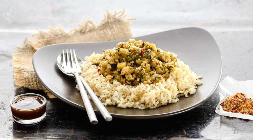 В этой же посуде промазываем ее оливковым маслом, вливаем столовую ложку соевого соуса, подсолим и добавим приправы.