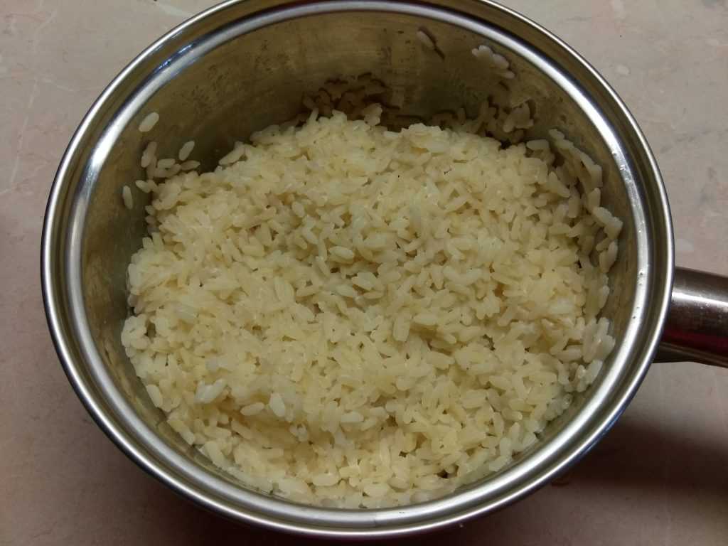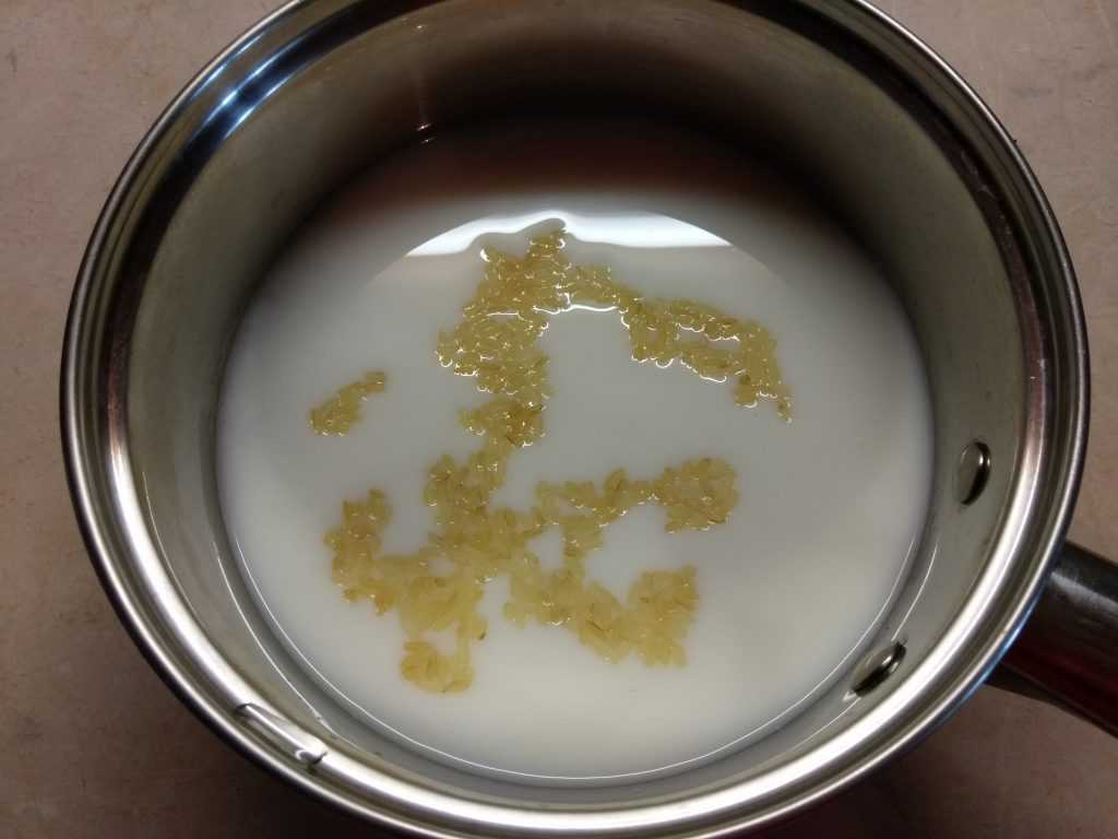 Рис залить водой, смешанной с молоком и варить до готовности.