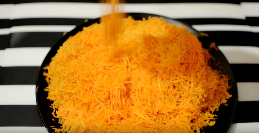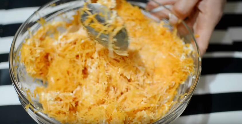 - Очищаем морковь, промываем ее в воде и пропускаем через мелкую терку. Далее добавляем измельченный овощ в массу из творога.