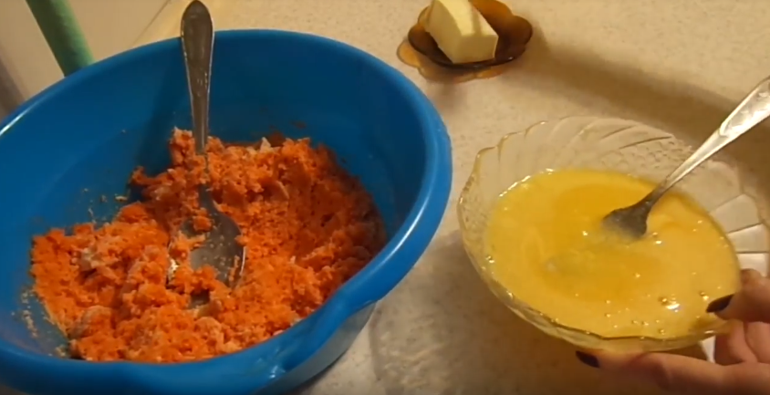 - Морковь измельчаем блендером. Берем одну емкость с морковью и добавляем сахар, масло и яйца. Затем добавляем манку и разрыхлитель, солим. Оставляем тесто на 20 минут до набухания манки.
