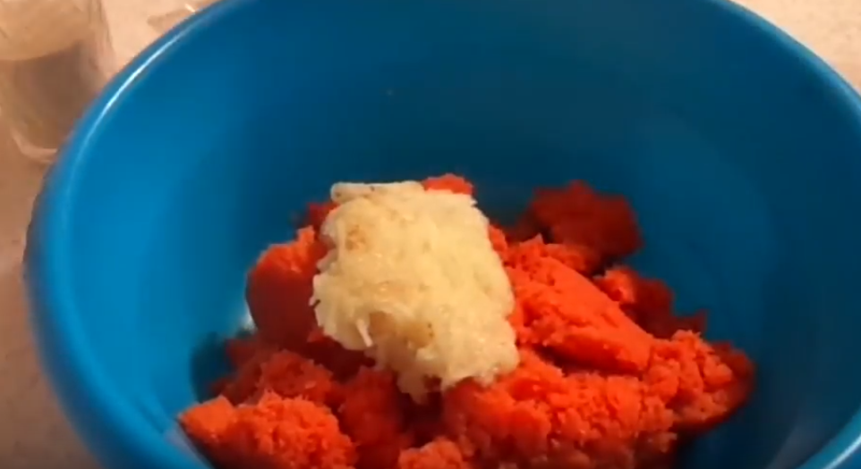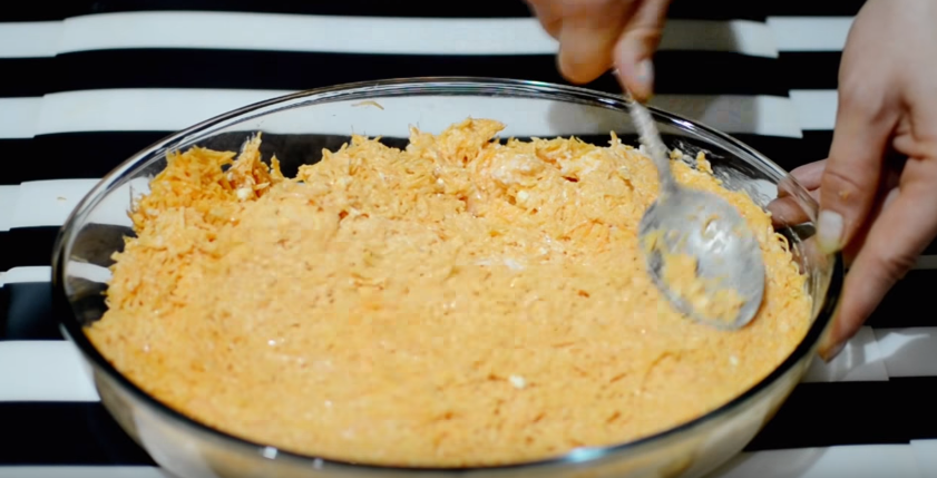 - Смешиваем приготовленную массу с манкой и даем ей постоять минут 15. Сырую морковку натираем на мелкой терке, смешиваем её с творожным тестом.