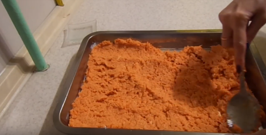 Они не должны смешиваться с общей массой, лучше, чтобы добавки были вкраплениями и явно чувствовались в блюде. Вариант с курагой выглядит особенно привлекательно, красноватый оттенок от моркови с вкраплениями этого сушеного абрикоса сочетается хорошо. На вкус подобный десерт будет интересным и необычным.