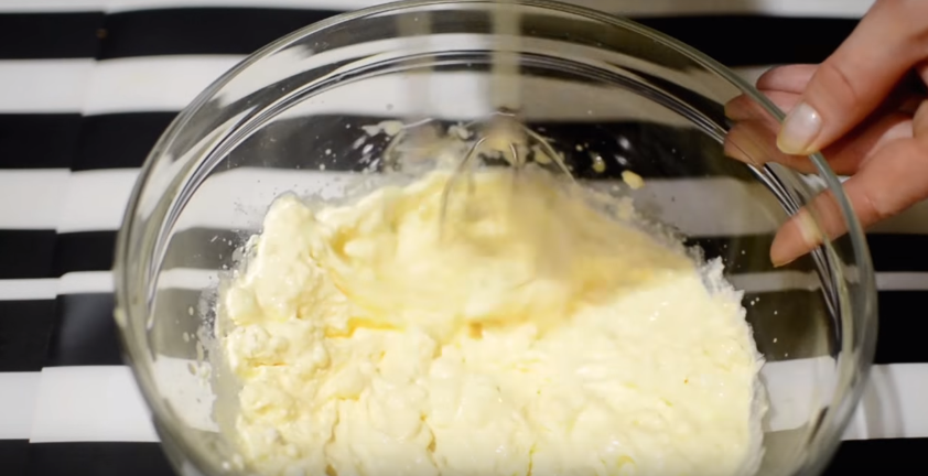 - В отдельной миске смешиваем сметану с творогом и растираем до тех пор, пока у нас не получится однородная консистенция. Когда масса будет готова, перекладываем ее к яйцам, которые мы перед этим взбили с сахаром. Хорошо перемешиваем ингредиенты.