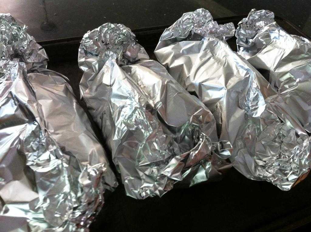 - Плотно завернуть фольгу. Сделать ножом небольшое отверстие для выхода пара.
