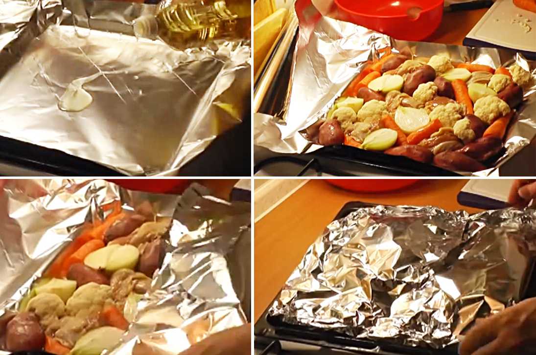 4. На застеленный фольгой и промазанный растительным маслом противень выкладываем приготовленные овощи перемешанные с мясом. Накрываем фольгой и отправляем в духовку на 40 минут при 180 градусах.