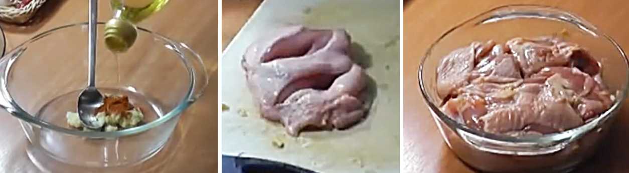 - прессованные чесночные зубчики смешивают с майонезом соевым соусом, томатной пастой. Смесь солят, смешивают с приправами. Курицу замачивают в маринаде, оставляют пропитываться на полчаса и приступают к подготовке овощей;