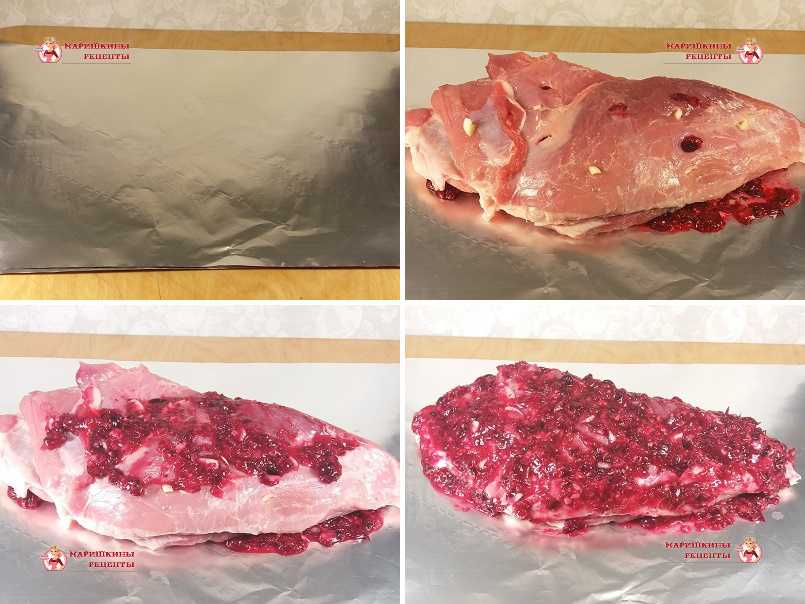 На следующий день свинина должна уже как следует промариноваться и приобрести восхитительный кисловатый ягодный привкус. Давайте не будем долго ждать и сразу же положим мясо в фольге на противень, а противень поместим в духовку. На первом этапе жарки большая температура не нужна. Выставим примерно 150 градусов, этого вполне достаточно.