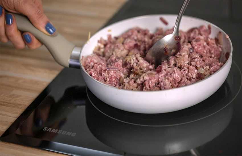 На эту же сковороду отправляем обжариваться фарш. Добавляем ещё немного растительного масла и жарим примерно 10 минут, разбивая его ложкой. Готовому фаршу даём немного остыть. В это время натираем сыр на крупной тёрке, а зелень мелко нарезаем. Теперь берём подходящую ёмкость, отправляем туда фарш, обжаренный кабачок с луком и чесноком, натёртый сыр и зелень. Добавляем соль с чёрным перцем по вкусу и хорошо перемешиваем.