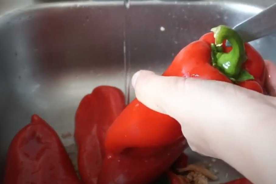 2. Следующий шаг, это перцы. С ними нужно проделать следующую работу: помыть под струей холодной воды, а далее ножом вырезать по кругу сердцевину, удалив косточки и перегородки.