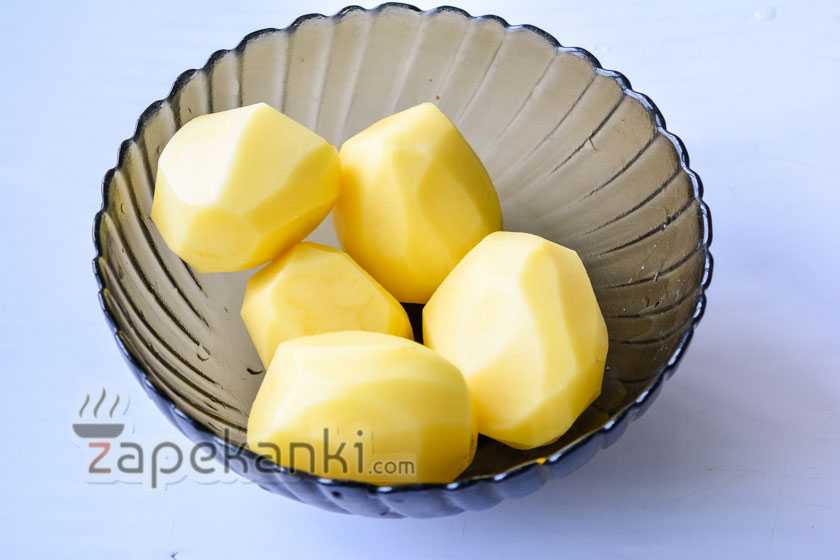 Готовый картофель достаньте из кастрюли, остудите в холодной воде, а затем снимите кожуру, легко соскребая ее ножом. Очищенные корнеплоды нарежьте кружочками средней толщины, так чтобы они не разваливались, но и не были очень уж толстыми.