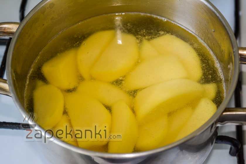 Картофель сложите в раковину и как следует промойте, счищая щеточкой с корнеплодов землю и прочий налипший мусор. После чего, не снимая пока кожуры, отправьте клубни вариться в кастрюле. Это называется, сварить картошку в мундире. Готовить овощи нужно до тех пор, пока они не станут мягкими и не будут легко протыкаться ножом или вилкой.