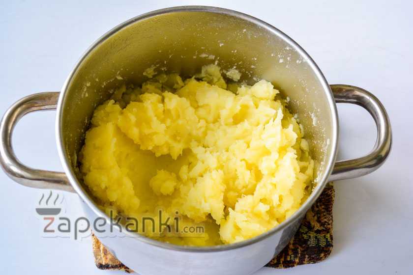 Толчем картофель ступкой или пюрируем блендером. Особо можете не стараться, небольшие картофельные комочки придадут массе вязкости, за счет которой картофельная запеканка с грибами будет лучше держать свою форму.