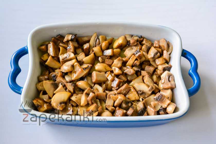 3. Мелко нарезанные грибочки обжарьте с луком и переложите в форму на слой фасоль, распределите ее равномерно по поверхности.