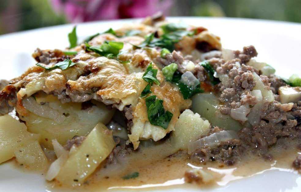 - Емкость смазать любым жиром, выложить отварной картофель, поверх – фарш. Разровнять, полить соусом.