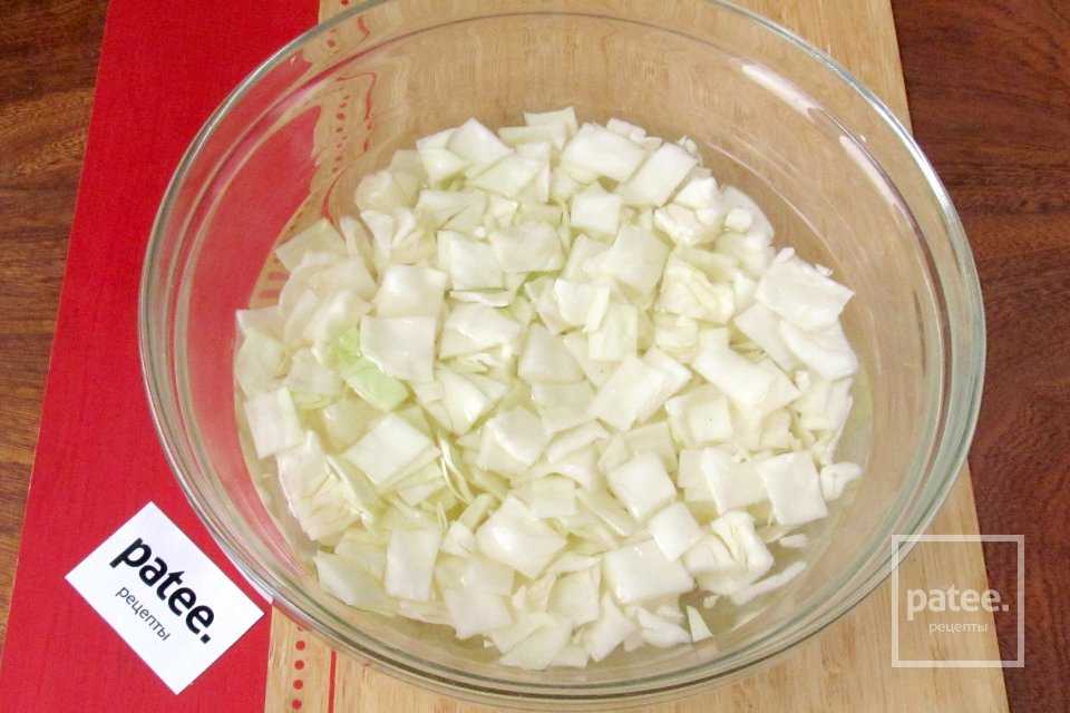 Белокочанную капусту разбиваем на листья и нарезаем их небольшими квадратиками. Перекладываем капустные квадратики в миску, обдаём кипятком, сливаем его, снова заливаем кипятком и оставляем на 10 минут. Если капуста жёсткая, то её лучше не заливать кипятком, а отварить в течении 5-10 минут.