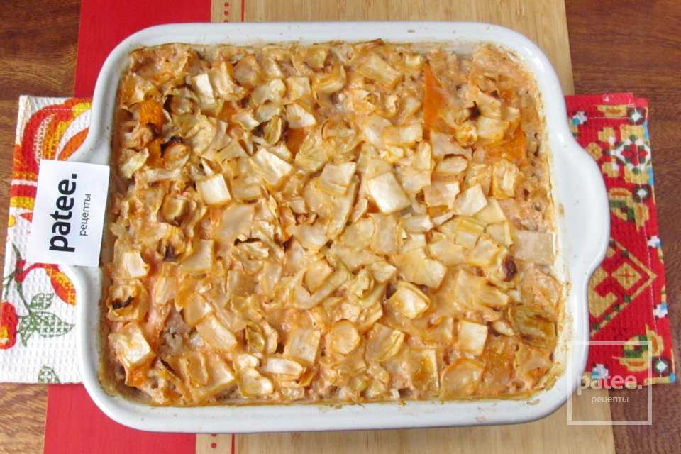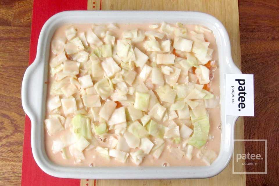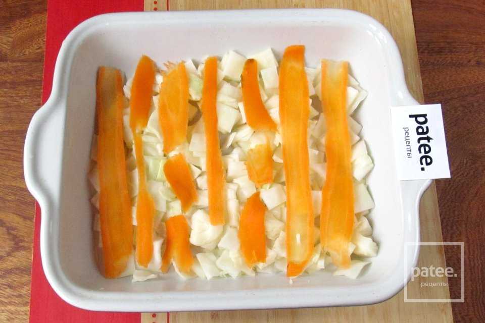 С мягкой капусты сливаем воду. Выкладываем половину капусты в форму для запекания, покрываем полосочками моркови.