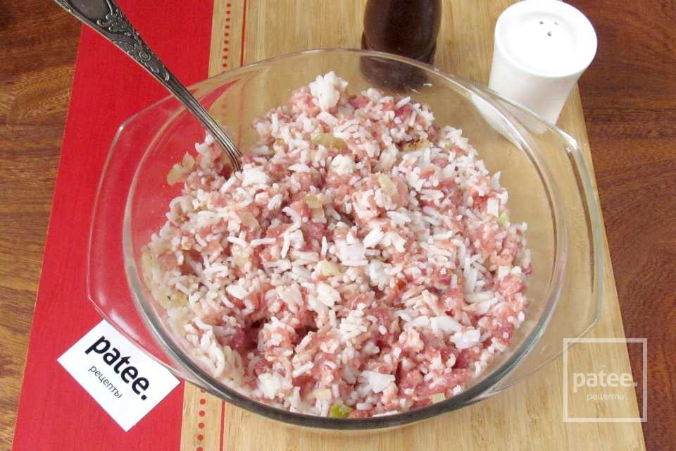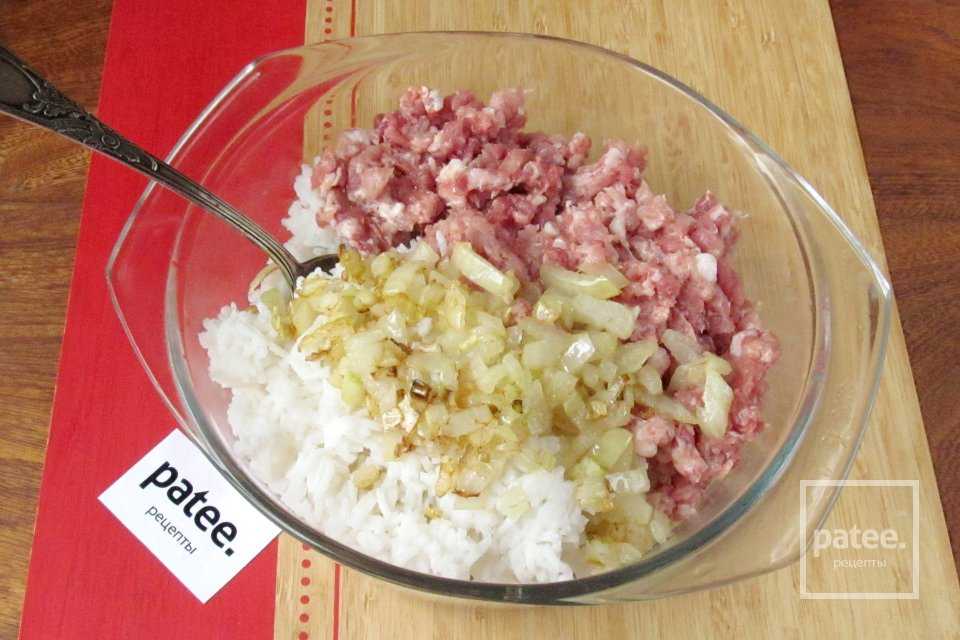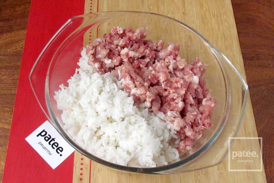 Отвариваем в подсоленной воде до полуготовности рис, промываем его, добавляем в миску со свиным фаршем. Рис подойдёт как круглозёрный, так и длинный типа басмати. В ингредиентах указано количество уже отваренного риса.