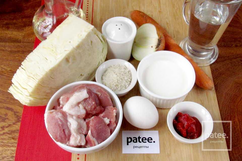 Для приготовления риса с фаршем и капустой в духовке нам понадобятся следующие ингредиенты: свинина, рис, капуста белокочанная, репчатый лук, морковь, томатная паста, сметана, куриное яйцо, вода, масло подсолнечное рафинированное, соль, чёрный молотый перец.