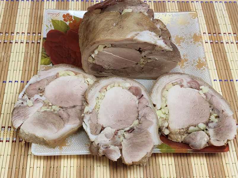 Для приготовления рулета выбираем крупную свиную рульку, опаливаем имеющуюся щетину над огнем и промываем тщательным образом продукт под проточной водой, соскабливая загрязнения при помощи щетки или ножа.
