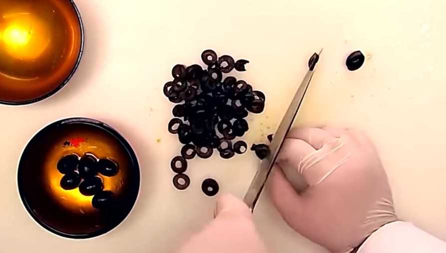 4. Огурец очистить от кожицы и нарезать соломкой. В этом блюде используются оливки фаршированные каперсами их нарезаем колечками.