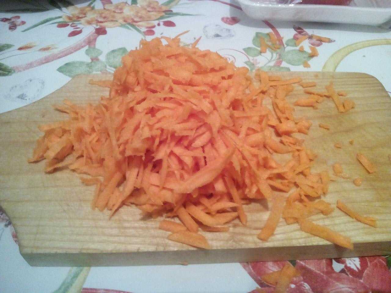 - Чистим и натираем морковь на мелкую терку, а также режим лук кубиками