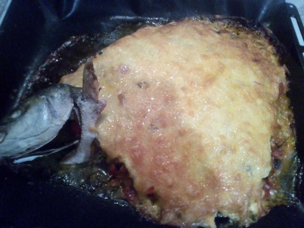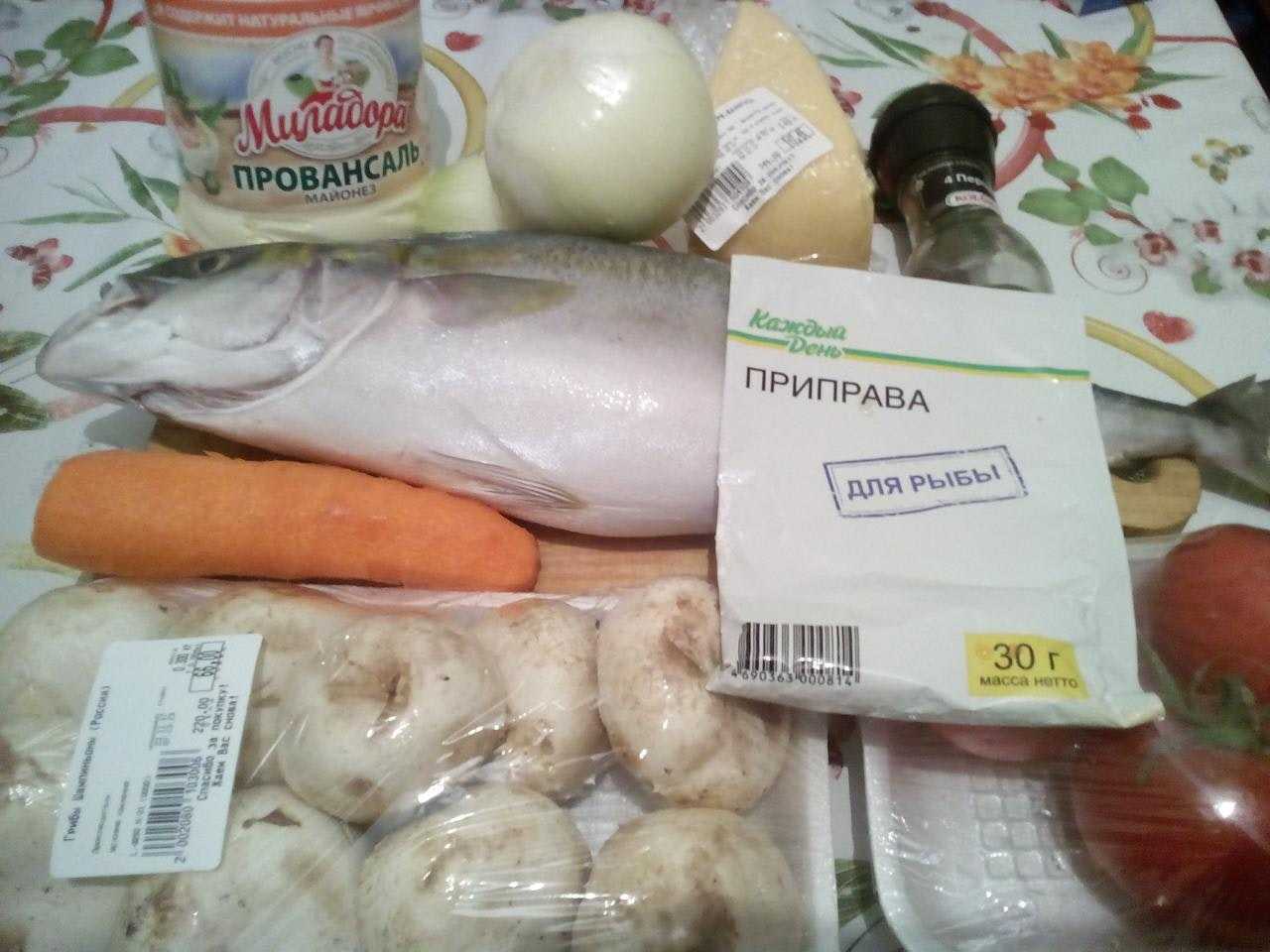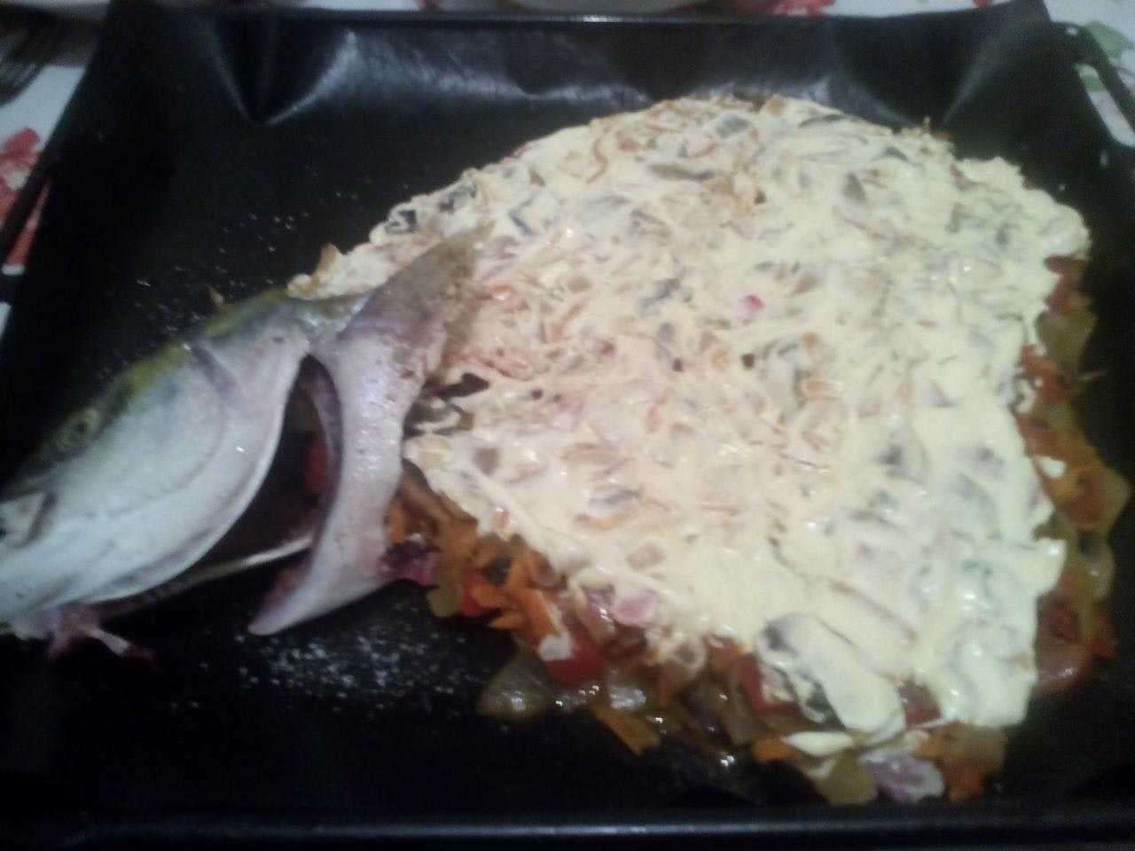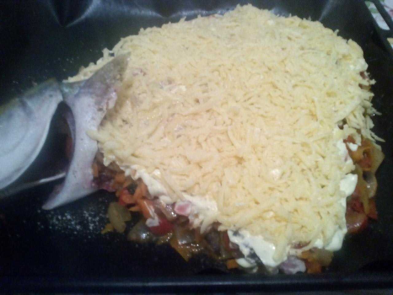 Включаем духовку на температуру 220 градусов. Пока она нагревается, выкладываем всё на противень в такой последовательности… Первая на шкуру ложиться лакедра, которая смазывается майонезом, подсаливается, перчиться, посыпается приправой…