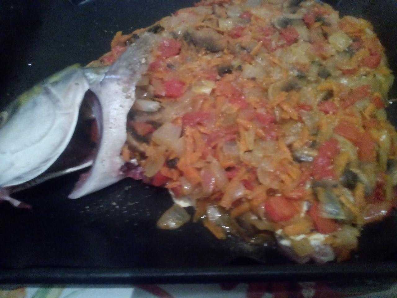 Далее все эта красотень ставиться в уже подготовленную духовку на 20 минут, а по истечению указанного время достается нежная, наполненная ароматами овощей, прекрасно пропеченная морская рыба.