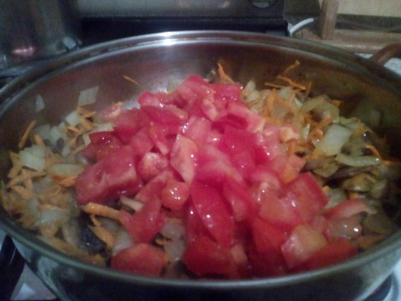 дальше добавляем помидоры и еще примерно 10 минут доводим обжарку до логического конца. Пять минут на большом огне, дальше на самом малом.