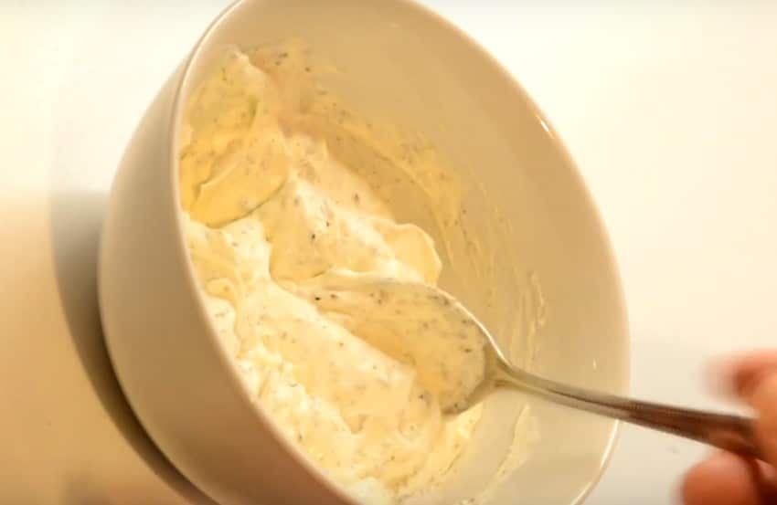 3. Приготовьте соус – смешайте сметану, кориандр, тимьян и базилик. Добавьте соль и перец по вкусу, а также пропущенный через пресс чеснок.