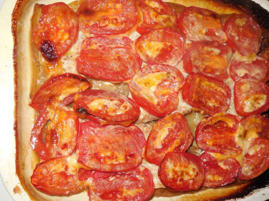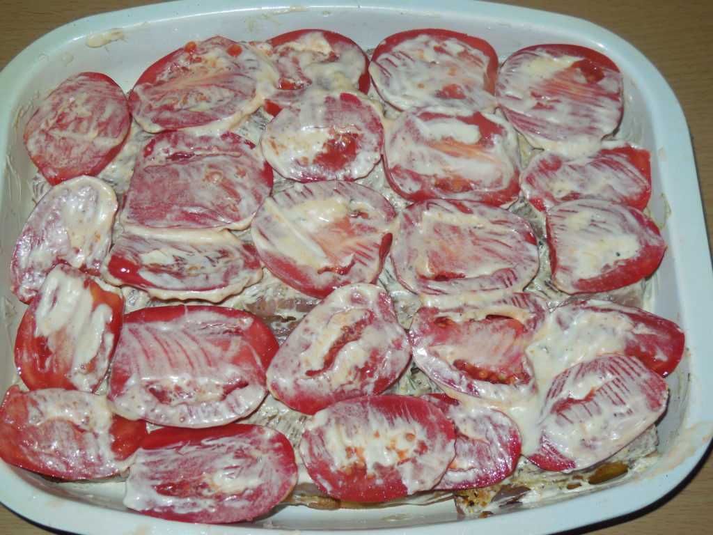 - Разогреваем духовой шкаф при температуре 180 градусов. У нас есть пара минут, чтобы выложить поверх начинки помидоры и полить их майонезом. Делаем температуру чуть выше. Ставим внутрь духовки противень с заготовками и томим 60 минут.